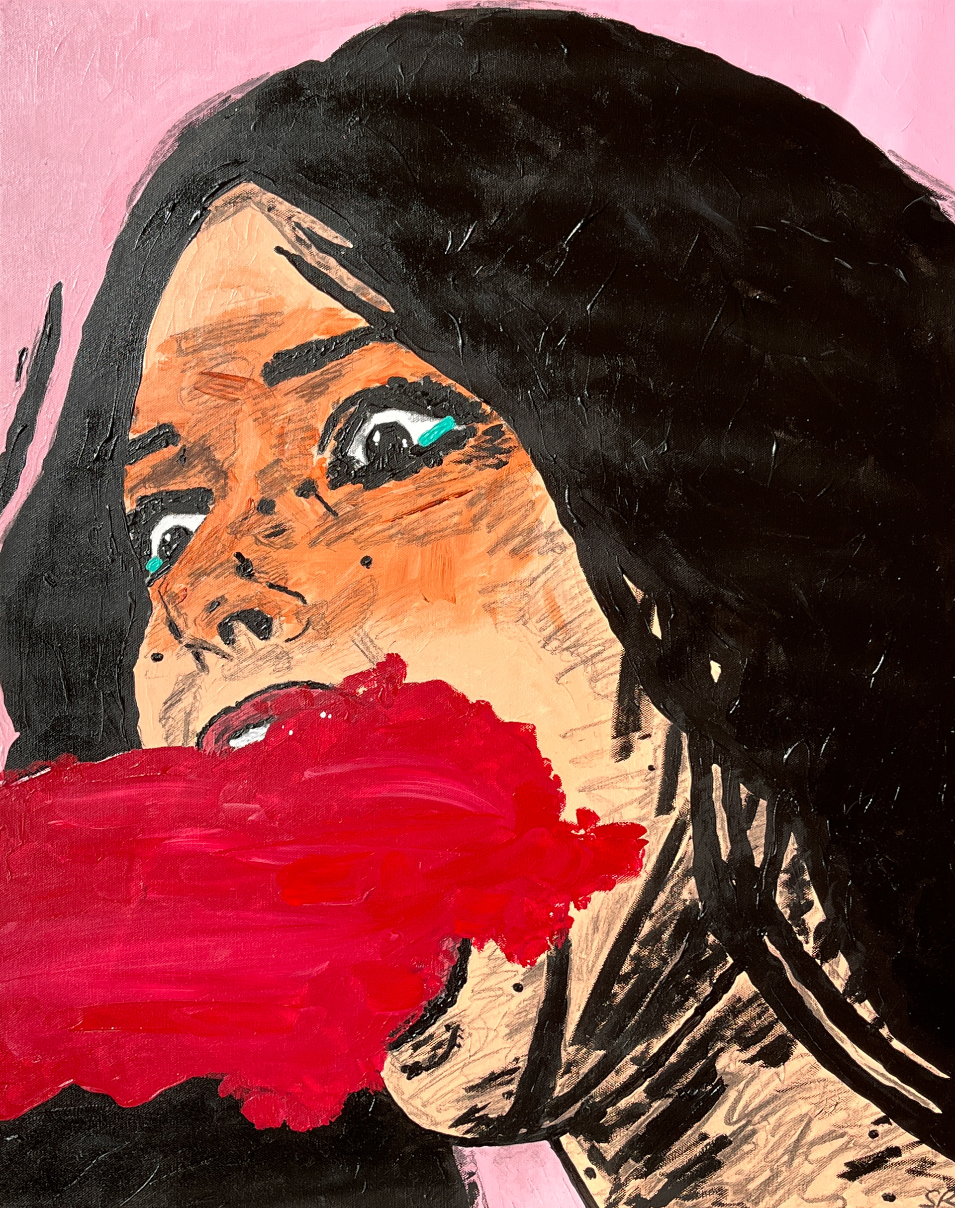 Doing this portrait came originally out of thinking about what Iranian women are in constant battle with these days and the real-life horror movie they’ve been put through. But, while working on the piece my own feelings also came bubbling up from past experiences where I felt I was being silenced/ignored or that my body no longer belonged to me and therefore was forced into an eerie type of isolation (something like The Sunken Place in the movie “Get Out”).