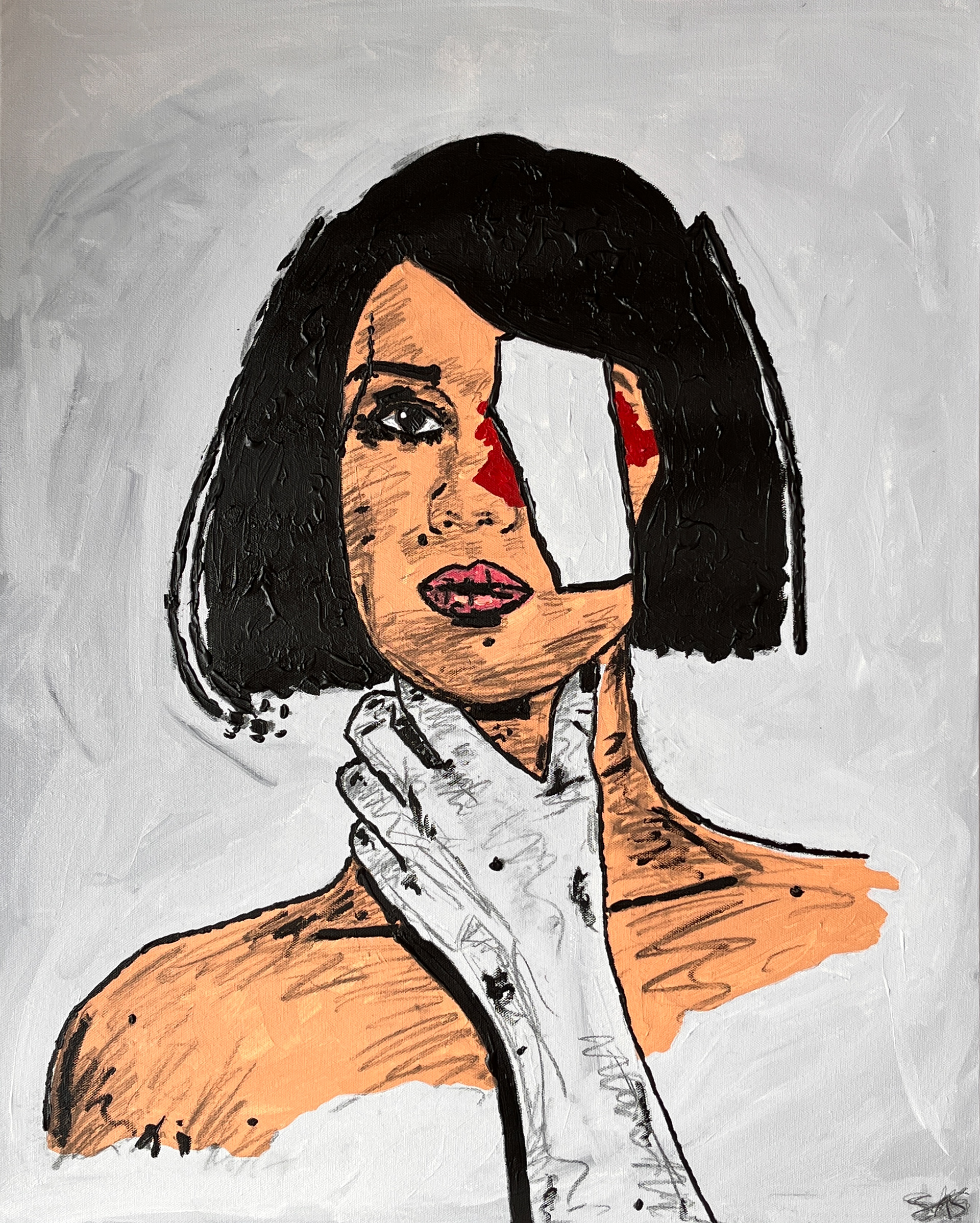 This is probably the darkest portrait I’ve done. The man’s hand wrapping around the neck of the woman who appears to be naked and vulnerable, paired with the title I gave this piece, implies the additional horror she’s about to go through. Given the chaotic and overwhelmingly dark true stories behind this painting of what’s been happening in Iran (from the eye injuries purposefully inflicted by members of the regime to the sexual violence and torture the protesters are faced with), I let myself make things less neat than in previous portraits. I also got lost in the lyrics of the song “Violet” by Hole and replayed it a bunch of times while working on the painting.